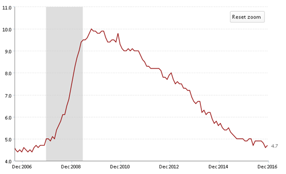 同時(shí),就業(yè)情況也有所改善,失業(yè)率已從2009年10月最高的10%降到了2016年12月的4.7%。