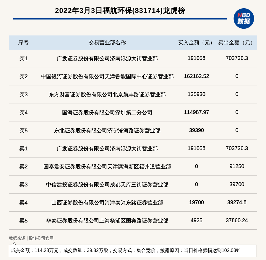 每經(jīng)訊,2022年3月3日,新三板創(chuàng)新層公司福航環(huán)保(831714)登上龍虎榜,交易方式是集合競價,披露原因是當(dāng)日價格振幅達到102.03%,成交數(shù)量39.82萬股,成交金額114.28萬元。買一席位為廣發(fā)證券股份有限公司濟南濼源大街營業(yè)部,買入19.11萬元;賣一席位為廣發(fā)證券股份有限公司濟南濼源大街營業(yè)部,賣出70.37萬元。