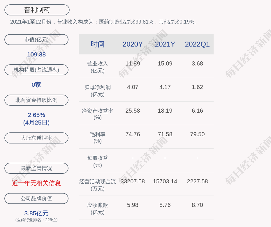 2021年1至12月份,普利制藥的營(yíng)業(yè)收入構(gòu)成為:醫(yī)藥制造業(yè)占比99.81%,其他占比0.19%。