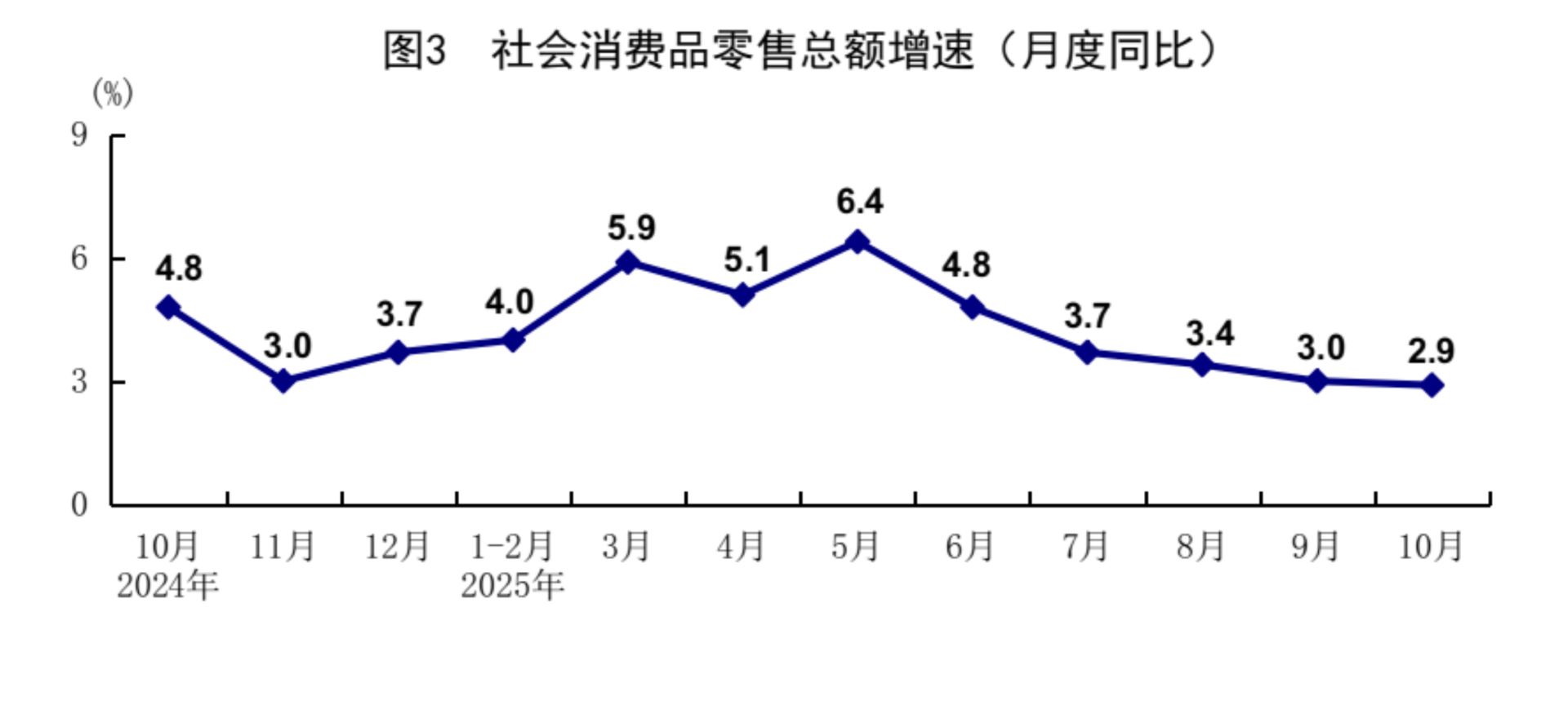10月份社會消費(fèi)品零售總額同比增長2.9% 圖片來源:國家統(tǒng)計局