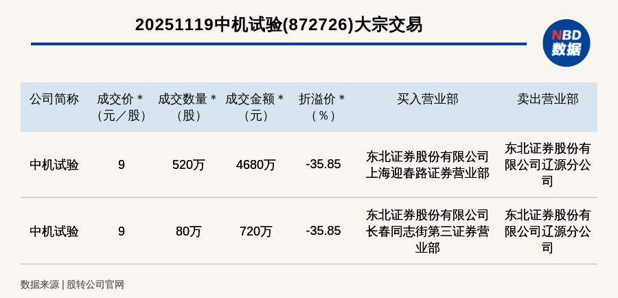 每經(jīng)訊,2025年11月19日,新三板創(chuàng)新層公司中機(jī)試驗(yàn)(872726,收盤價(jià):14.03元)發(fā)生2筆大宗交易,總成交金額為5400萬(wàn)元,成交金額最高的一筆成交價(jià)9元/股,成交數(shù)量520萬(wàn)股,成交金額4680萬(wàn)元,折價(jià)35.85%。買入營(yíng)業(yè)部是東北證券股份有限公司上海迎春路證券營(yíng)業(yè)部,賣出營(yíng)業(yè)部是東北證券股份有限公司遼源分公司。