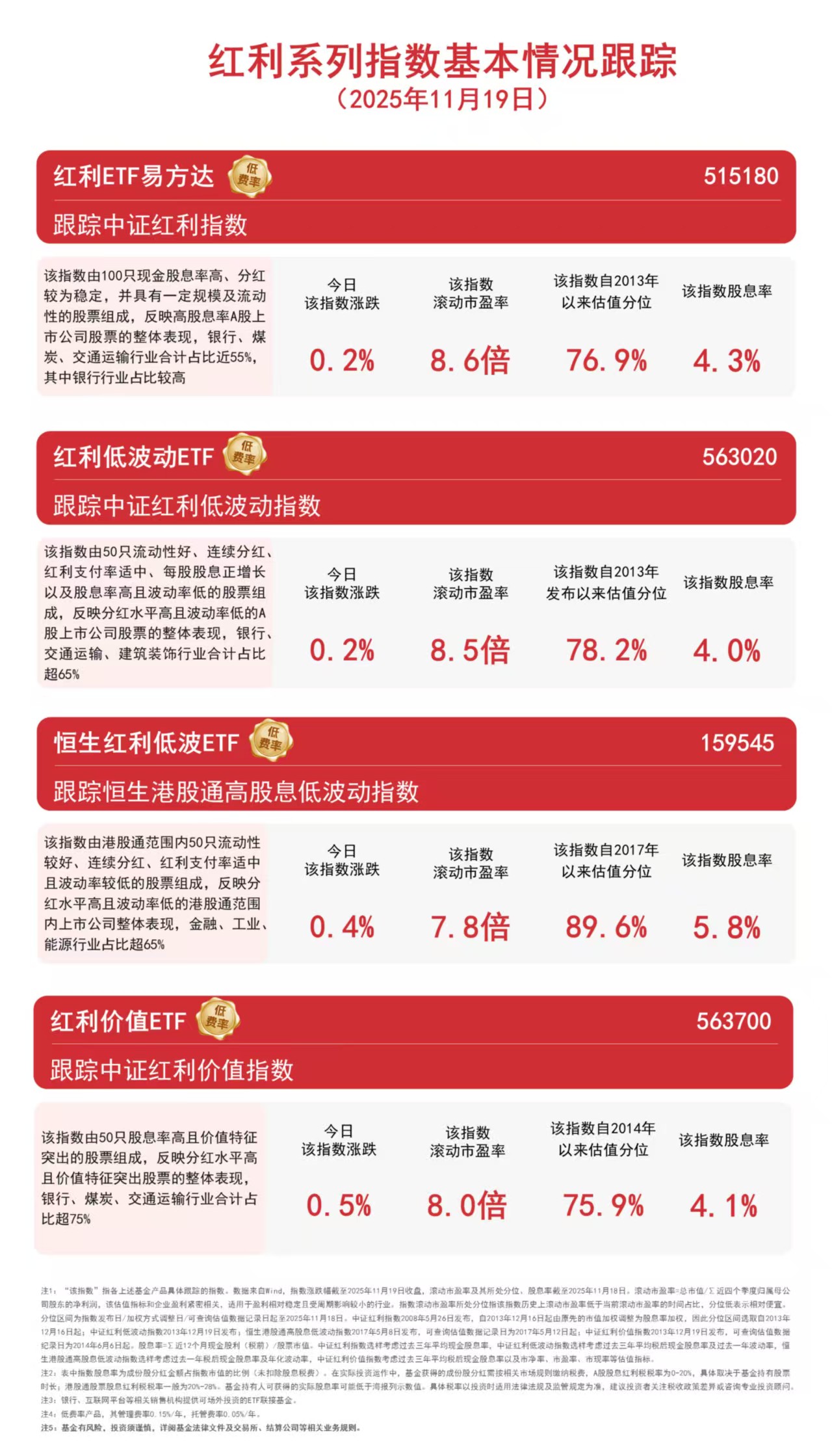 據(jù)悉,易方達基金是目前唯一一家紅利類ETF全部實行低費率的基金公司,恒生紅利低波ETF(159545)、紅利ETF易方達(515180)、紅利低波動ETF(563020)、紅利價值ETF(563700)等產品管理費率均為0.15%/年,可助力投資者低成本布局高股息資產。