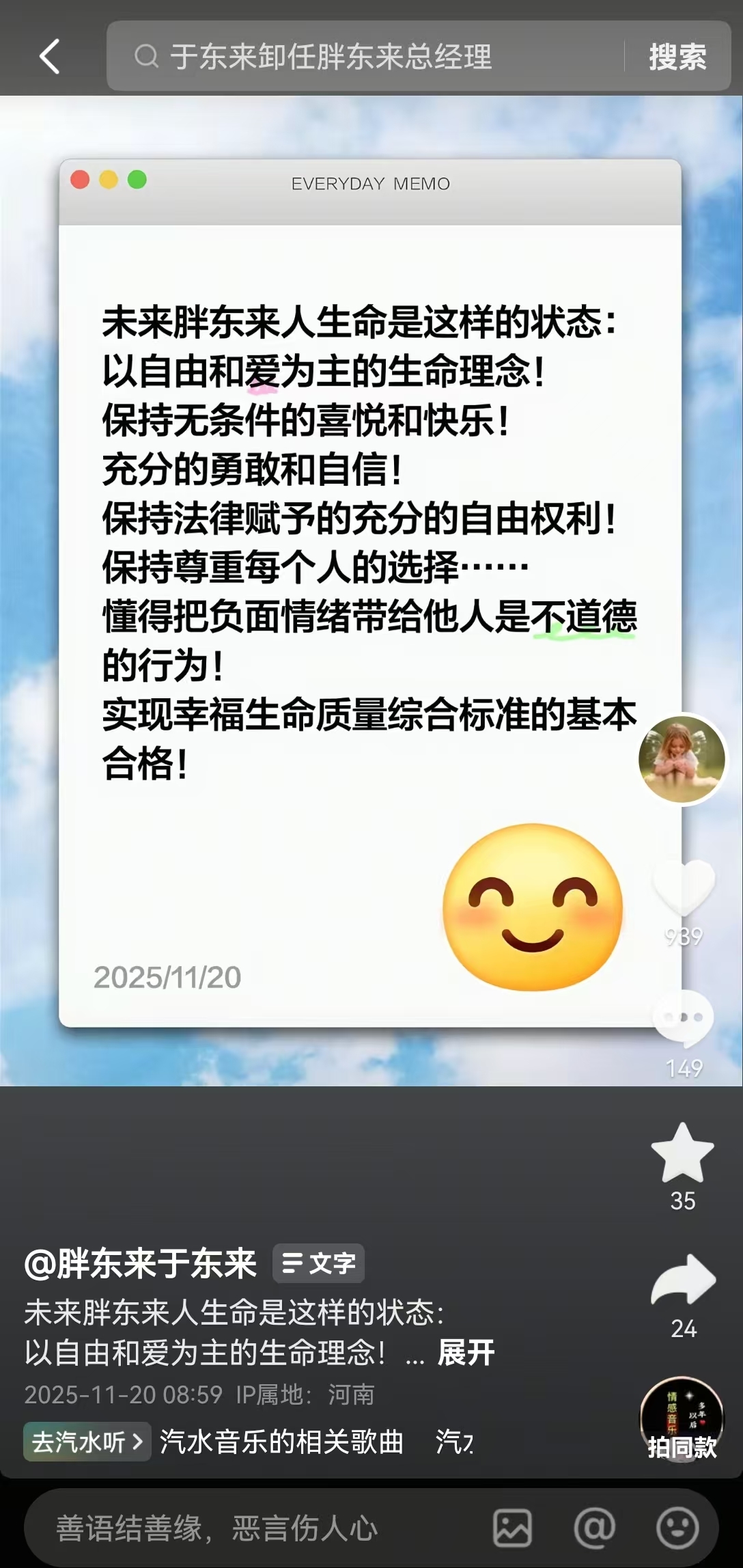 11月20日,胖東來創(chuàng)始人于東來在社交平臺發(fā)文稱,未來胖東來人的生命是這樣的狀態(tài):以自由和愛為主的生命理念,保持無條件的喜悅和快樂,充分的勇敢和自信,保持法律賦予的充分的自由權(quán)利,保持尊重每個人的選擇。