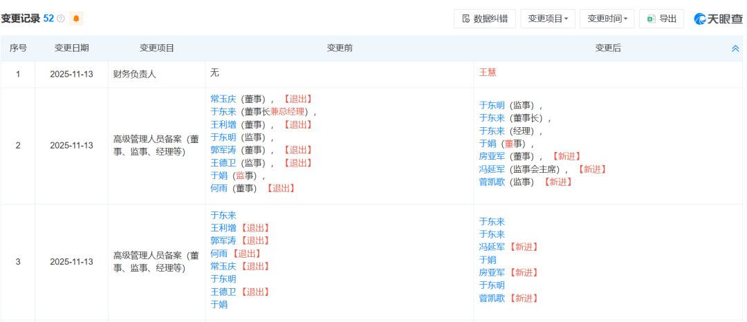 同時,胖東來多位高管發(fā)生變更,常玉慶、王利增、郭軍濤、王德衛(wèi)、何雨五名董事退出,新增房亞軍為新任董事,馮延軍任監(jiān)事會主席,王慧任財務(wù)負(fù)責(zé)人,菅凱歌任監(jiān)事。