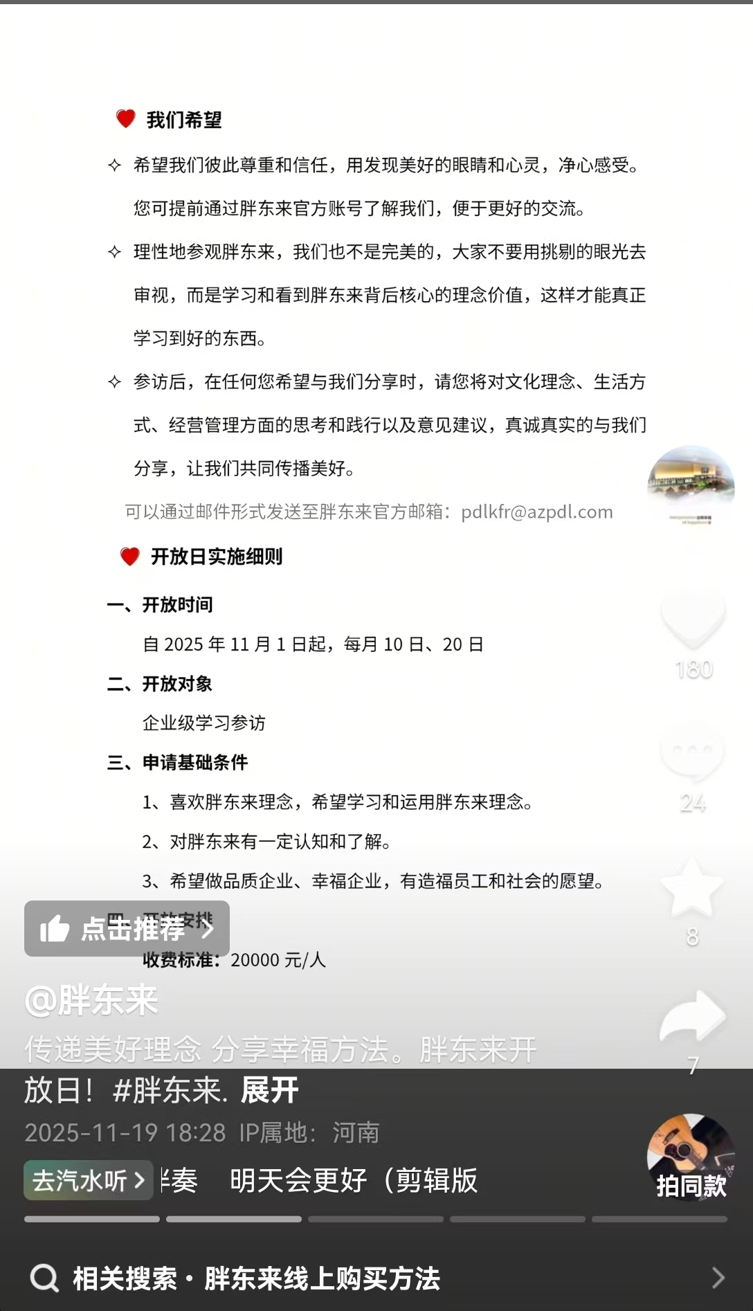 自2025年11月1日起,胖東來每月10日、20日面向企業(yè)級學(xué)習(xí)參訪開放,收費標(biāo)準(zhǔn)2萬元/人。