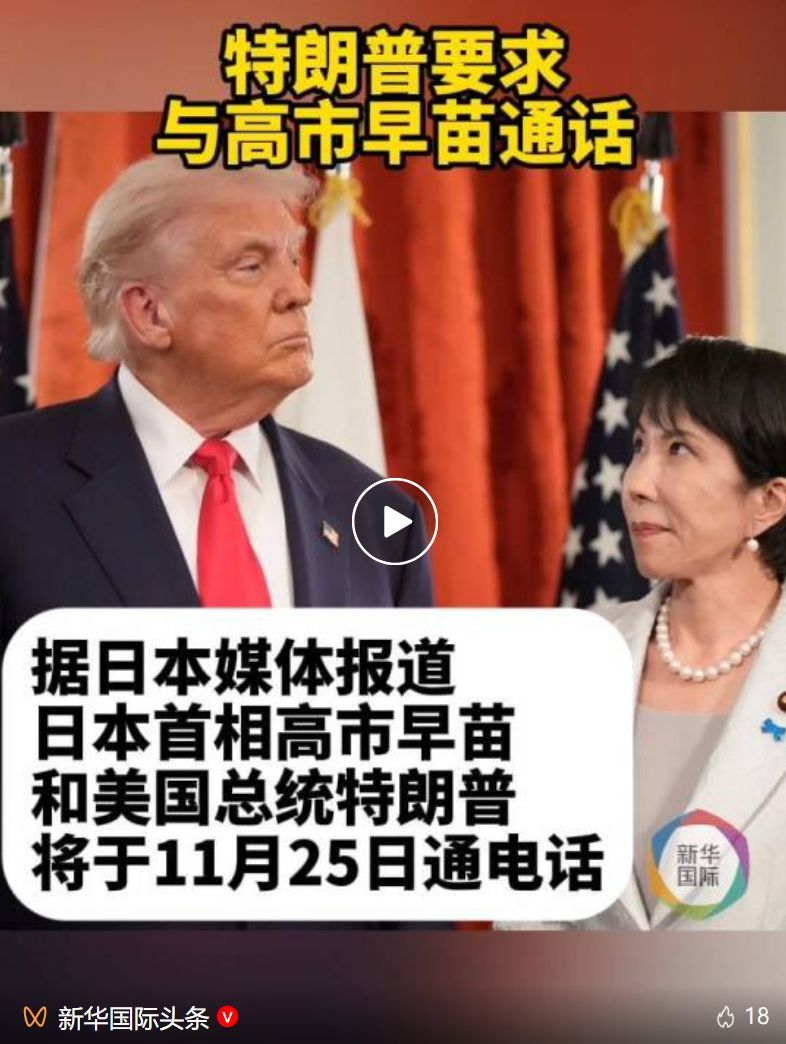 據(jù)新華國際頭條官方微信號,日本富士新聞網(wǎng)報道,日本首相高市早苗和美國總統(tǒng)唐納德·特朗普準(zhǔn)備于11月25日通電話。據(jù)報道,此次通話要求是特朗普方面提出的。