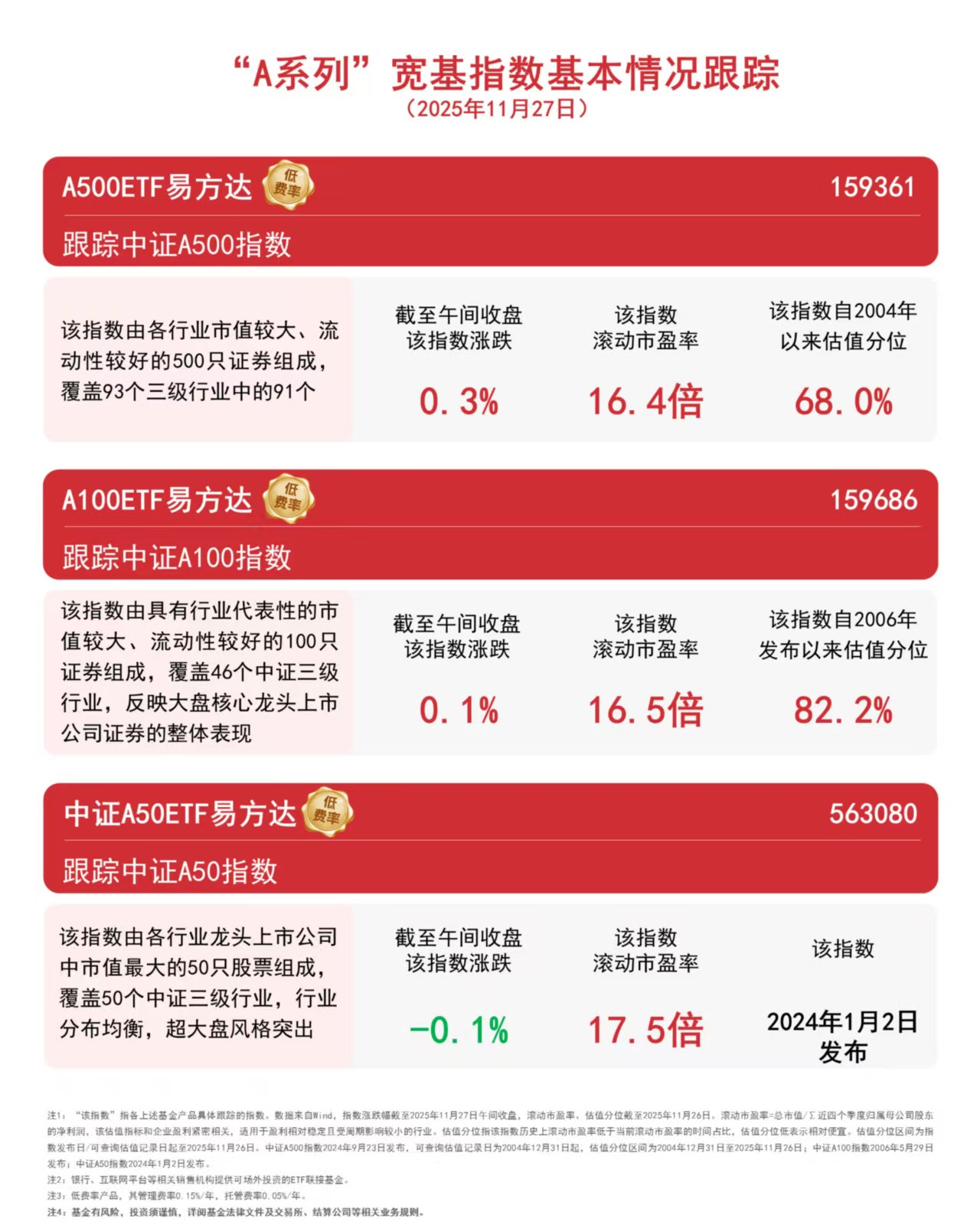 截至午間收盤,中證A500指數(shù)上漲0.3%,中證A100指數(shù)上漲0.1%,中證A50指數(shù)下跌0.1%,A500ETF易方達(dá)(159361)半日成交額近30億元,獲超1億份凈申購。