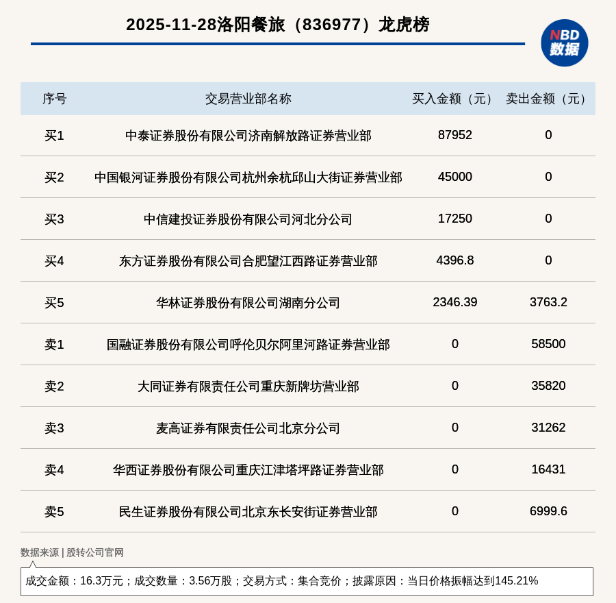 每經(jīng)訊,2025年11月28日,新三板創(chuàng)新層公司洛陽餐旅(836977,收盤價(jià):6.38元)登上龍虎榜,交易方式是集合競價(jià),披露原因是當(dāng)日價(jià)格振幅達(dá)到145.21%,成交數(shù)量3.56萬股,成交金額16.3萬元。買一席位為中泰證券股份有限公司濟(jì)南解放路證券營業(yè)部,買入8.8萬元;賣一席位為國融證券股份有限公司呼倫貝爾阿里河路證券營業(yè)部,賣出5.85萬元。