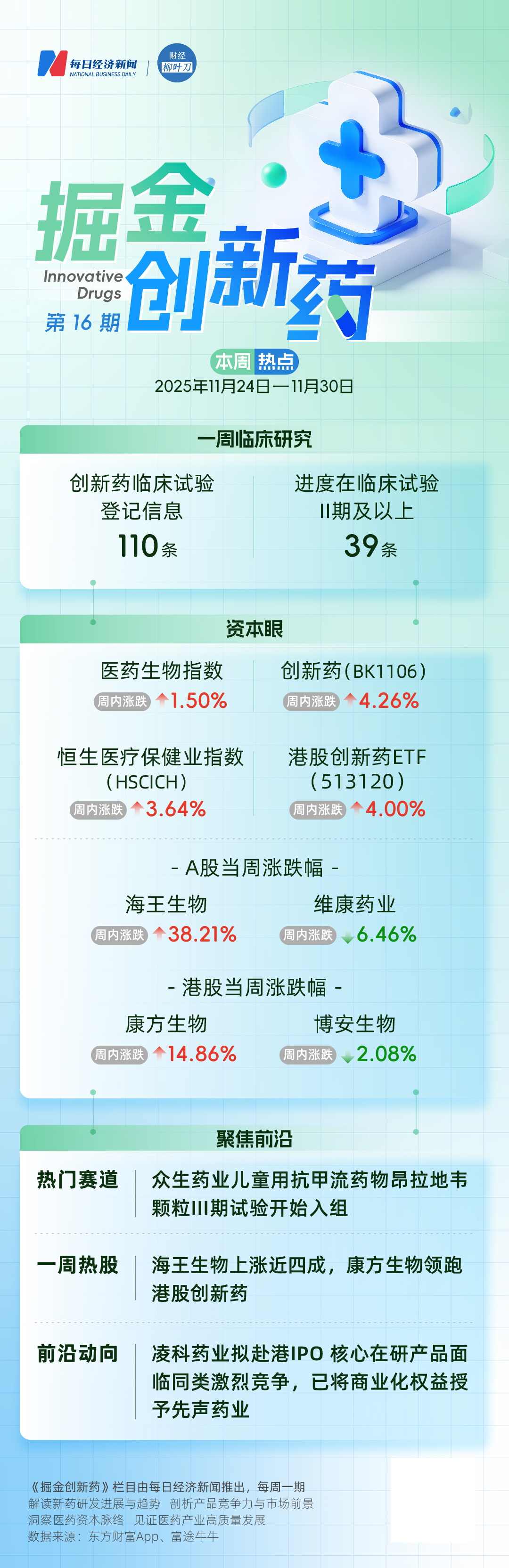 11月24日至28日,醫(yī)藥生物指數(shù)漲1.5%,細(xì)分板塊原料藥等領(lǐng)漲,血液制品收跌,資金情緒謹(jǐn)慎。凌科藥業(yè)擬赴港IPO,核心產(chǎn)品面臨同類競(jìng)爭(zhēng)。國(guó)家藥監(jiān)局披露110條臨床試驗(yàn)登記信息,4款創(chuàng)新藥獲批。眾生藥業(yè)啟動(dòng)兒童抗甲流藥物III期試驗(yàn)入組,科倫博泰SKB500啟動(dòng)小細(xì)胞肺癌II期臨床。勁方醫(yī)藥創(chuàng)始人呂強(qiáng)談市場(chǎng)起伏,稱將與投資者保持順暢溝通。