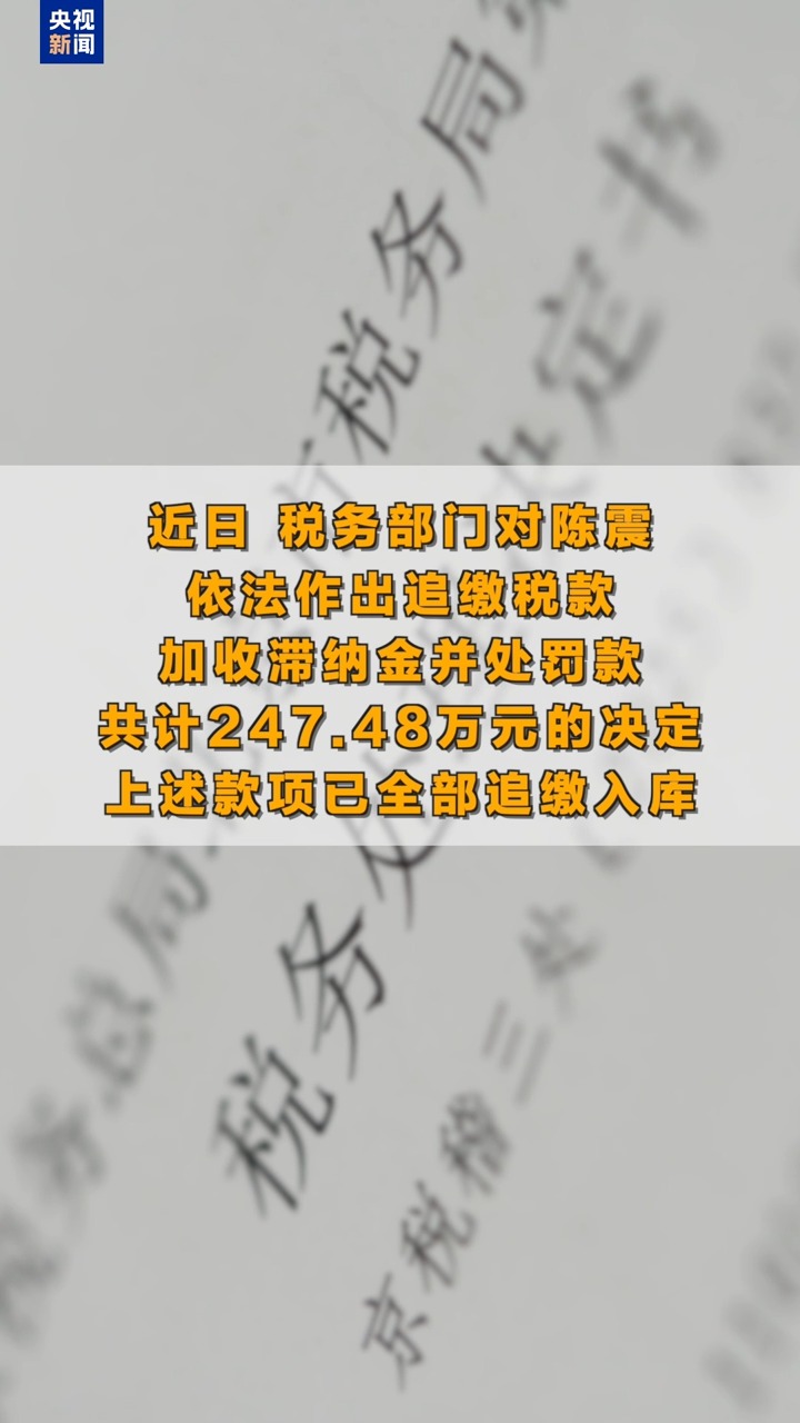 近日,稅務(wù)部門對陳震依法作出追繳稅款、加收滯納金并處罰款共計247.48萬元的決定,上述款項已全部追繳入庫。
