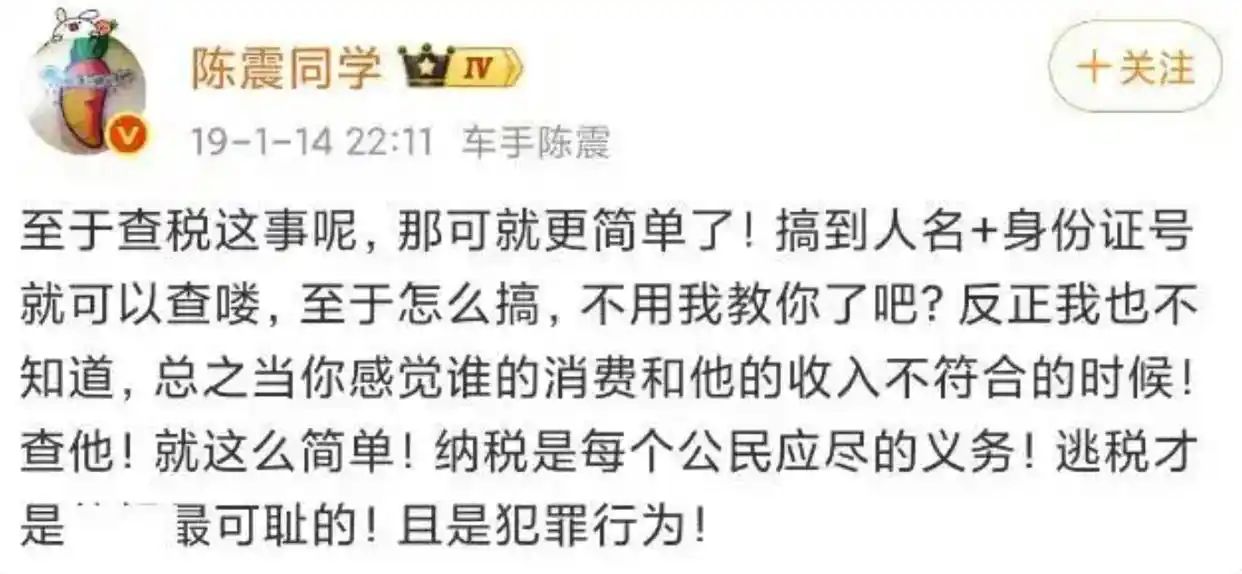 值得注意的是,2019年1月14日,陳震曾發(fā)布微博表示:“查稅這事呢,那可就更簡單了!搞到人名+身份證號就可以查?!薄爱?dāng)你感覺誰的消費和他的收入不符合的時候,查他!就這么簡單!納稅是每個公民應(yīng)盡的義務(wù)!逃稅才是最可恥的!且是犯罪行為! ”