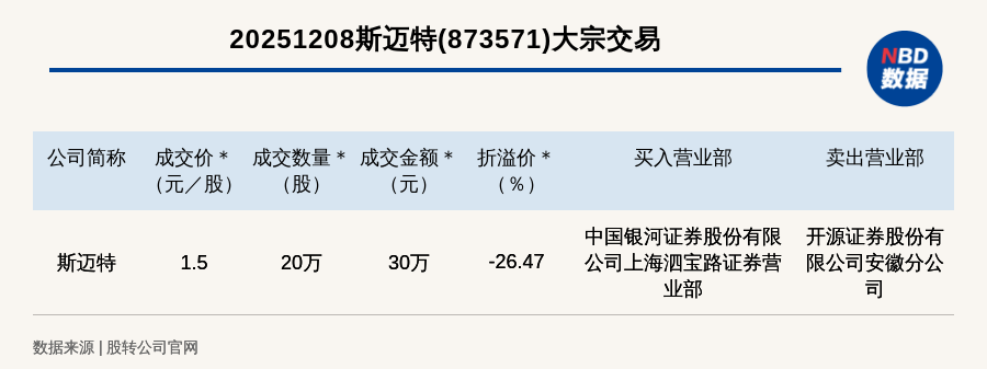 每經訊,2025年12月8日,新三板創(chuàng)新層公司斯邁特(873571,收盤價:2.04元)發(fā)生一筆大宗交易,成交價1.5元/股,成交數(shù)量20萬股,成交金額30萬元,折價26.47%。買入營業(yè)部是中國銀河證券股份有限公司上海泗寶路證券營業(yè)部,賣出營業(yè)部是開源證券股份有限公司安徽分公司。