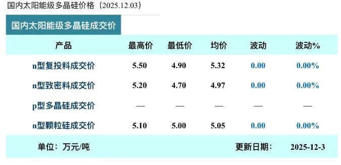 據(jù)信息服務(wù)機(jī)構(gòu)安泰科統(tǒng)計(jì),在11月最后一周,多晶硅N型復(fù)投料成交價(jià)格區(qū)間為4.9萬~5.5萬元/噸,成交均價(jià)為5.32萬元/噸,環(huán)比持平。N型顆粒硅成交價(jià)格區(qū)間為5.0萬~5.1萬元/噸,成交均價(jià)為5.05萬元/噸,環(huán)比持平。