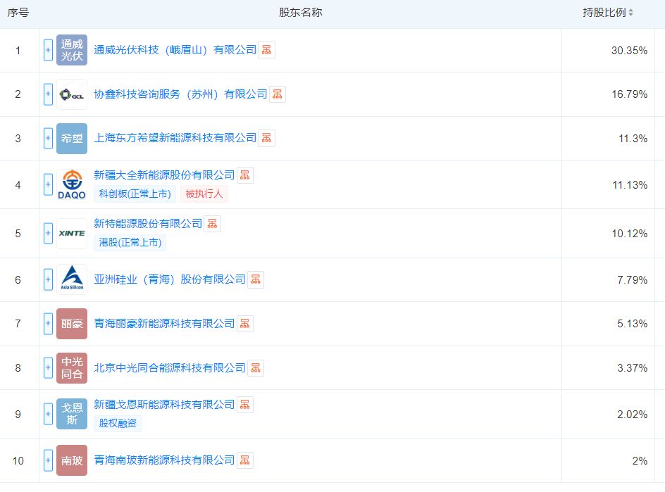 光和謙成注冊(cè)資本30億元,共有10名股東,包括9家硅料企業(yè)。其中包括:新特能源(HK01799),大全能源(SH688303),通威股份旗下的通威光伏科技(峨眉山)有限公司,南玻A(SZ000012)旗下的深圳南玻新能源產(chǎn)業(yè)發(fā)展有限公司,協(xié)鑫科技咨詢服務(wù)(蘇州)有限公司,中國光伏行業(yè)協(xié)會(huì)全資持有的北京中光同合能源科技有限公司,等等。