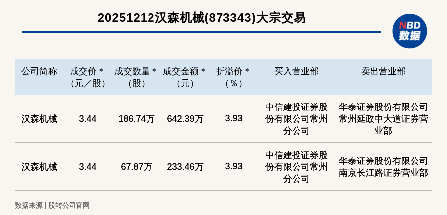 每經(jīng)訊,2025年12月12日,新三板創(chuàng)新層公司漢森機(jī)械(873343,收盤價(jià):3.31元)發(fā)生2筆大宗交易,總成交金額為875.85萬元,成交金額最高的一筆成交價(jià)3.44元/股,成交數(shù)量186.74萬股,成交金額642.39萬元,溢價(jià)3.93%。買入營業(yè)部是中信建投證券股份有限公司常州分公司,賣出營業(yè)部是華泰證券股份有限公司常州延政中大道證券營業(yè)部。