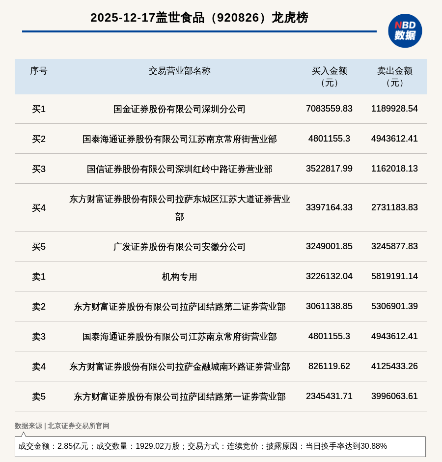 每經(jīng)訊,2025年12月17日,北交所上市公司蓋世食品(920826,收盤價:14.32元)登上龍虎榜,交易方式是連續(xù)競價,披露原因是當日換手率達到30.88%,成交數(shù)量1929.02萬股,成交金額2.85億元。買一席位為國金證券股份有限公司深圳分公司,買入708.36萬元;賣一席位為機構(gòu)專用,賣出581.92萬元。