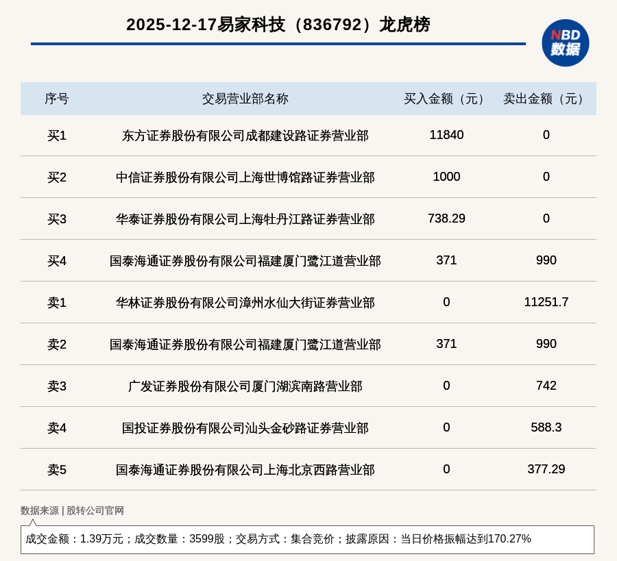 每經(jīng)訊,2025年12月17日,新三板基礎(chǔ)層公司易家科技(836792,收盤價:3.7元)登上龍虎榜,交易方式是集合競價,披露原因是當(dāng)日價格振幅達(dá)到170.27%,成交數(shù)量3599股,成交金額1.39萬元。買一席位為東方證券股份有限公司成都建設(shè)路證券營業(yè)部,買入1.18萬元;賣一席位為華林證券股份有限公司漳州水仙大街證券營業(yè)部,賣出1.13萬元。