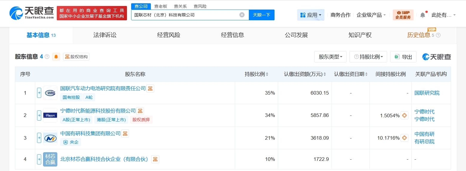 每經(jīng)AI快訊,天眼查工商信息顯示,近日,國聯(lián)芯材(北京)科技有限公司成立,法定代表人為趙尚騫,注冊(cè)資本約1.7億元人民幣,經(jīng)營范圍含電子專用材料研發(fā)、電子專用設(shè)備制造、電子專用設(shè)備銷售、新材料技術(shù)研發(fā)、新材料技術(shù)推廣服務(wù)、工程和技術(shù)研究和試驗(yàn)發(fā)展、電池銷售、新興能源技術(shù)研發(fā)、信息咨詢服務(wù)等。股東信息顯示,該公司由國聯(lián)汽車動(dòng)力電池研究院有限責(zé)任公司、寧德時(shí)代(300750)、中國有研科技集團(tuán)有限公司、北京材芯合贏科技合伙企業(yè)(有限合伙)共同持股。