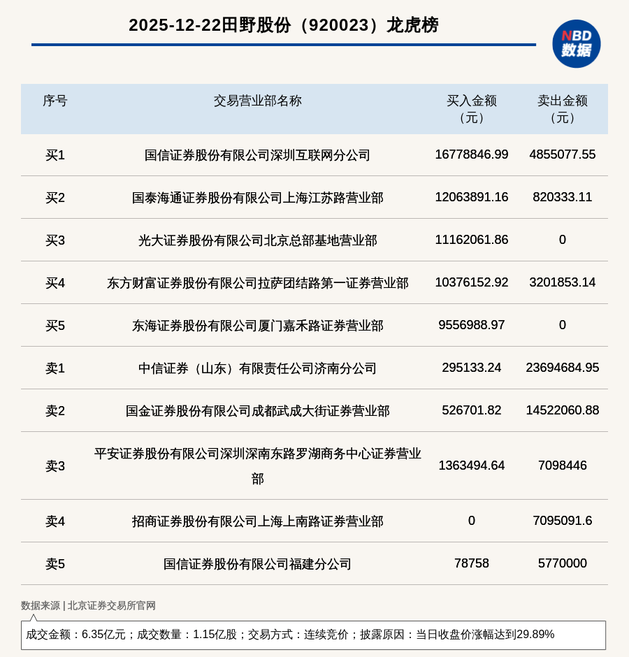 每經(jīng)訊,2025年12月22日,北交所上市公司田野股份(920023,收盤(pán)價(jià):5.91元)登上龍虎榜,交易方式是連續(xù)競(jìng)價(jià),披露原因是當(dāng)日收盤(pán)價(jià)漲幅達(dá)到29.89%,成交數(shù)量1.15億股,成交金額6.35億元。買一席位為國(guó)信證券股份有限公司深圳互聯(lián)網(wǎng)分公司,買入1677.88萬(wàn)元;賣一席位為中信證券(山東)有限責(zé)任公司濟(jì)南分公司,賣出2369.47萬(wàn)元。