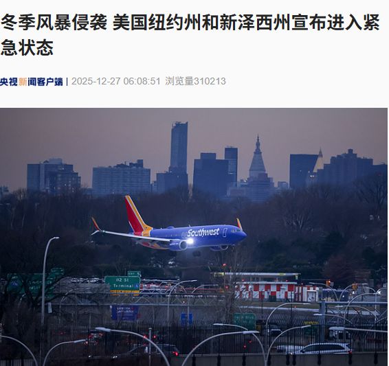 當(dāng)?shù)貢r間12月26日,強烈冬季風(fēng)暴侵襲美國東北部,紐約市等出行條件惡化,紐約州和新澤西州進(jìn)入緊急狀態(tài)。受風(fēng)暴預(yù)警影響,美國超1500架次航班取消,惡劣天氣對區(qū)域航空樞紐運行造成影響,預(yù)計影響持續(xù)至27日早間。25日,加州南部繼續(xù)遭風(fēng)暴襲擊,或引發(fā)更多災(zāi)害。此前一天風(fēng)暴已造成至少兩人死亡,6個縣進(jìn)入緊急狀態(tài)。