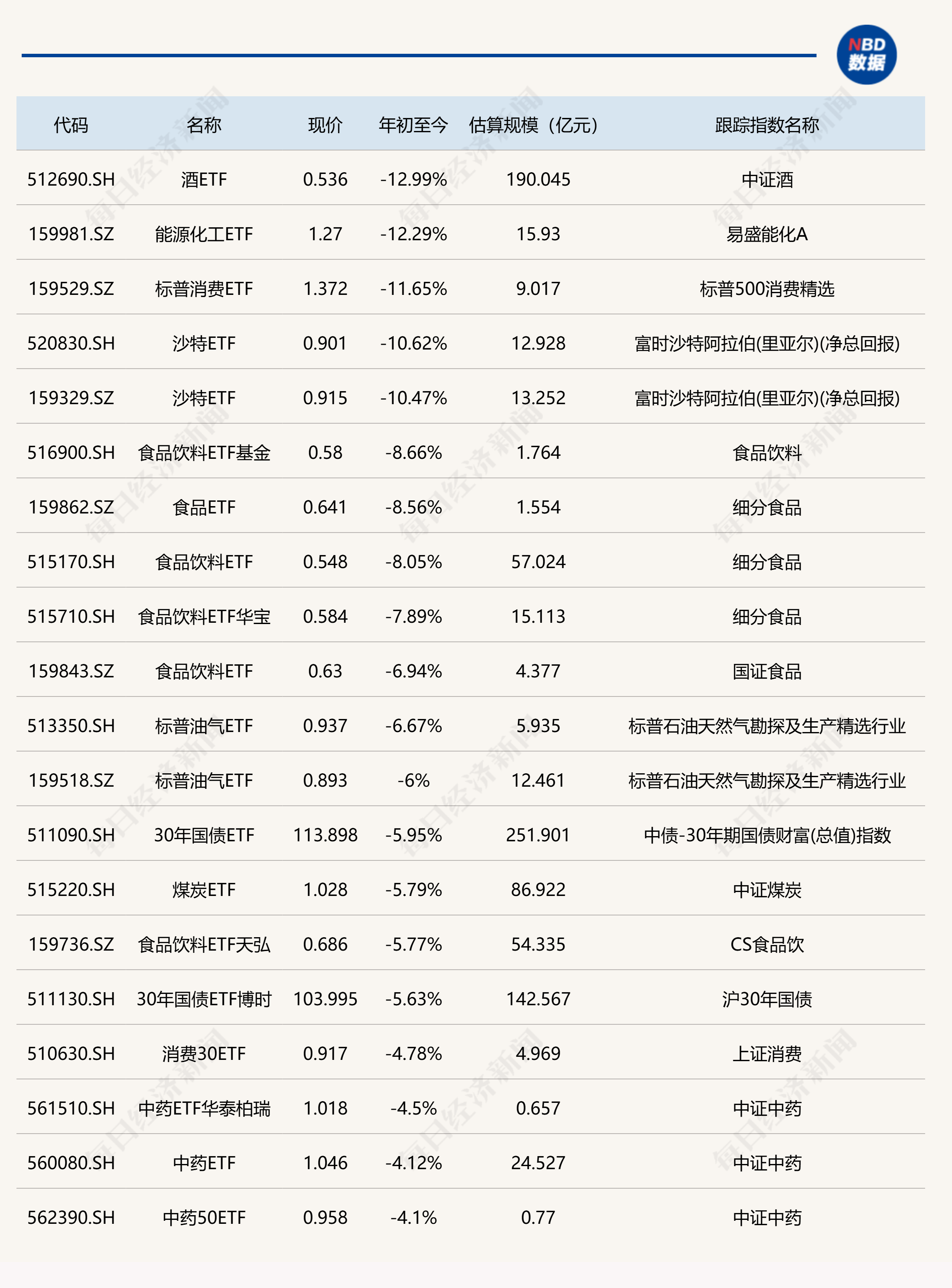 下跌方面,酒ETF、能源化工ETF跌超12%??缇矱TF中的標(biāo)普消費(fèi)ETF、沙特ETF跌超10%。