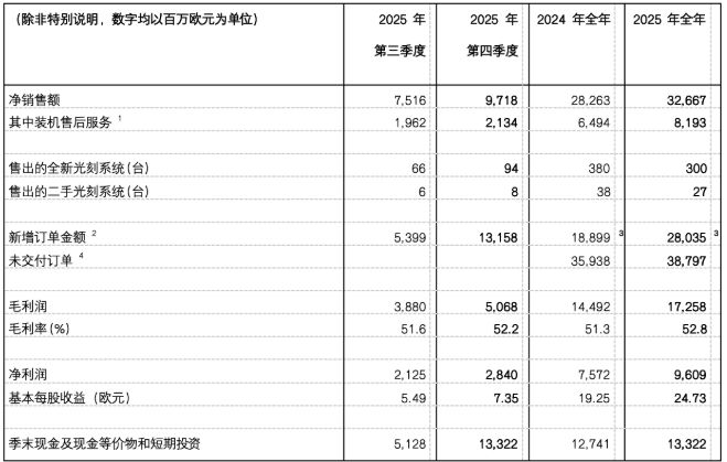 財(cái)報(bào)顯示,2025年第四季度,ASML實(shí)現(xiàn)凈銷售額97億歐元,毛利率為52.2%,凈利潤達(dá)28億歐元;第四季度的新增訂單金額為132億歐元,其中74億歐元為EUV光刻機(jī)訂單。
