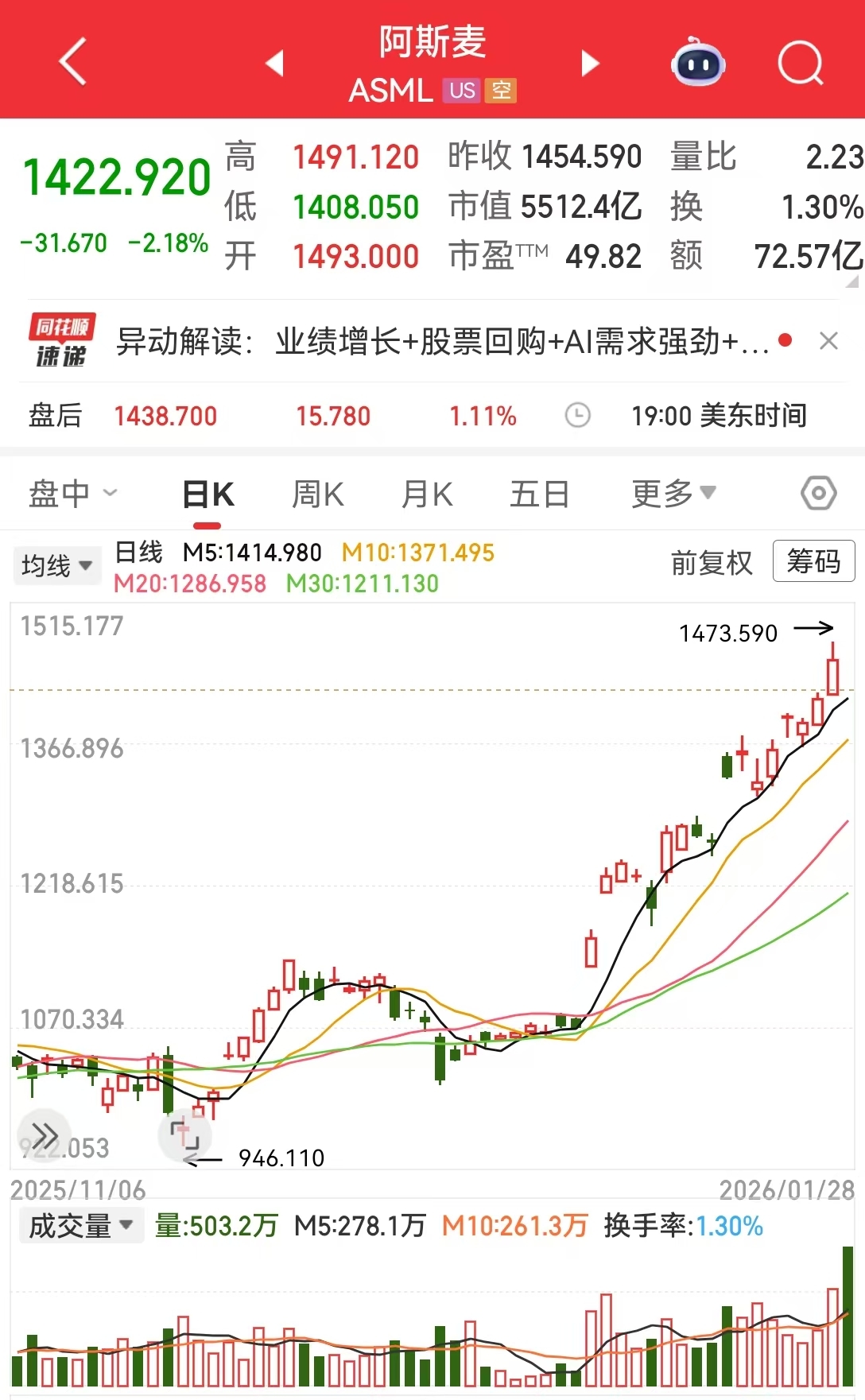 截至當(dāng)?shù)貢r(shí)間1月28日收盤,阿斯麥報(bào)1422.92美元,跌幅2.18%,市值5512.4億美元。
