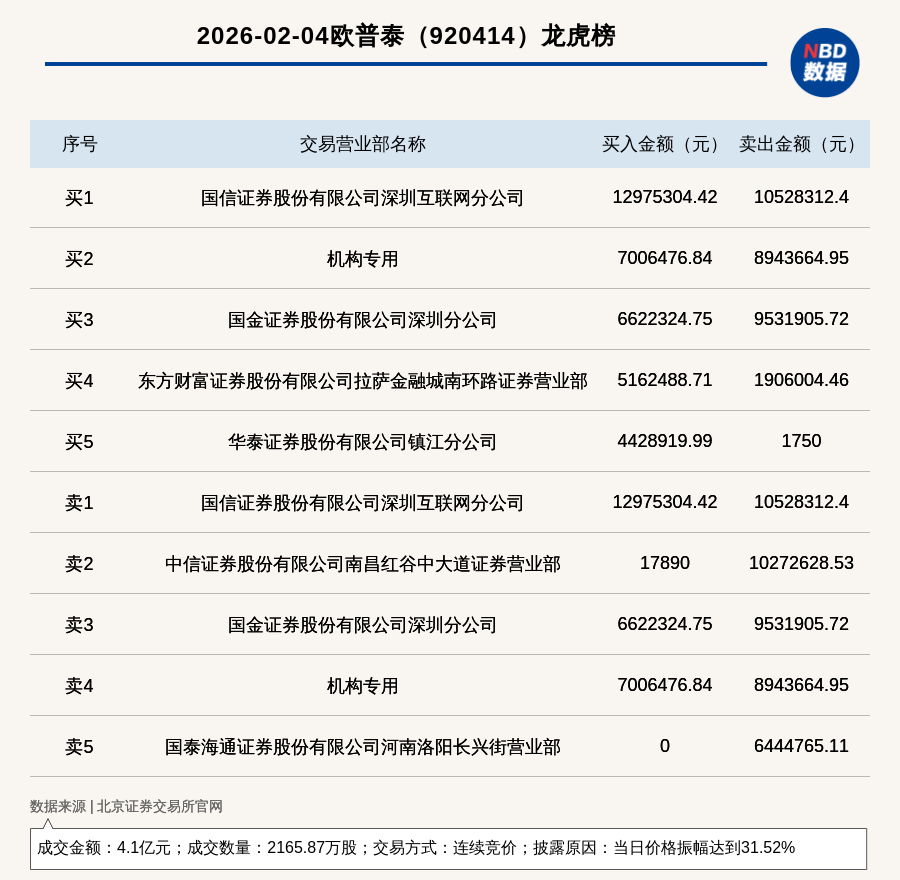 每經(jīng)訊,2026年2月4日,北交所上市公司歐普泰(920414,收盤價:19.35元)登上龍虎榜,交易方式是連續(xù)競價,披露原因是當(dāng)日價格振幅達(dá)到31.52%,成交數(shù)量2165.87萬股,成交金額4.1億元。買一席位為國信證券股份有限公司深圳互聯(lián)網(wǎng)分公司,買入1297.53萬元;賣一席位為國信證券股份有限公司深圳互聯(lián)網(wǎng)分公司,賣出1052.83萬元。