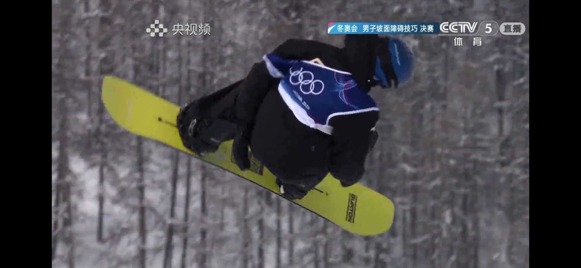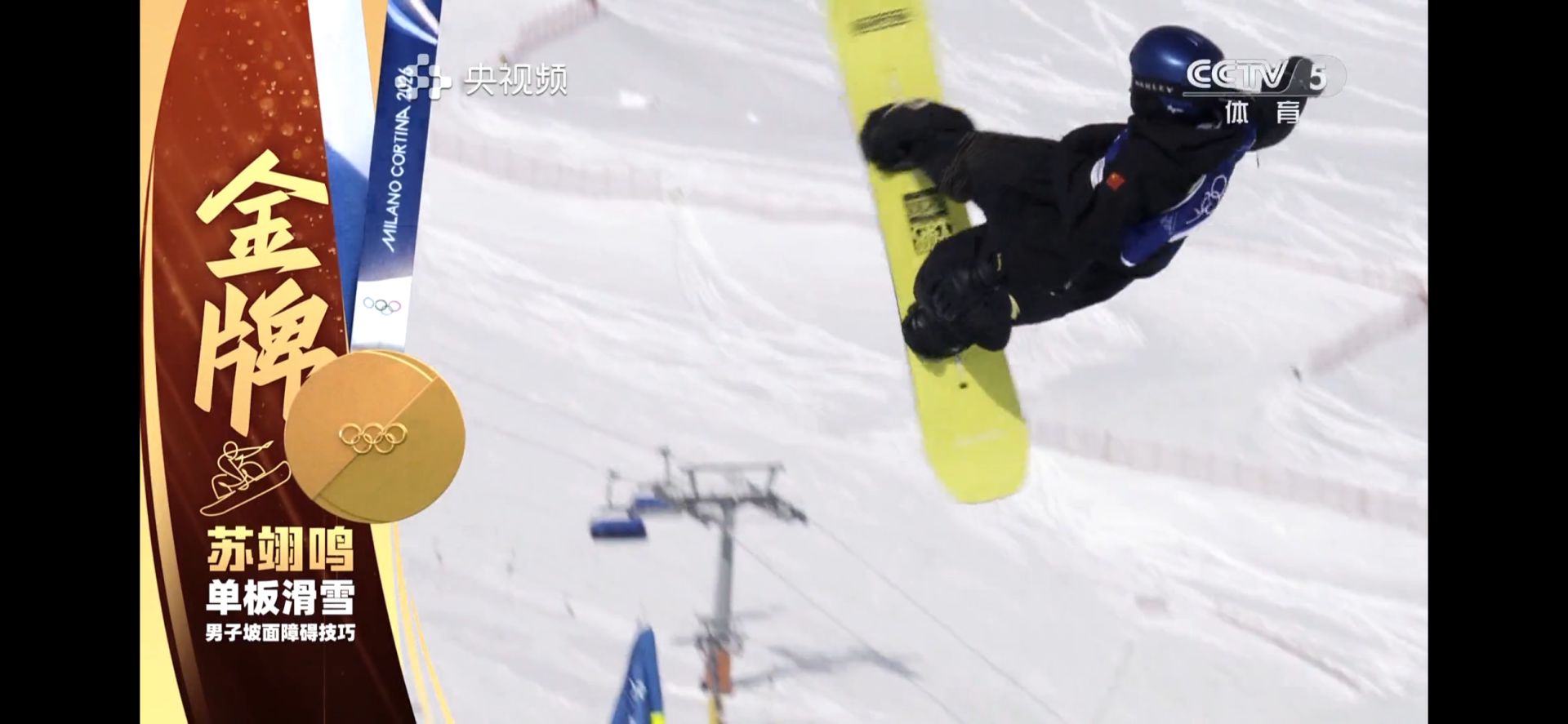 蘇翊鳴在米蘭冬奧會單板滑雪男子坡面障礙技巧決賽現(xiàn)場 央視頻截圖