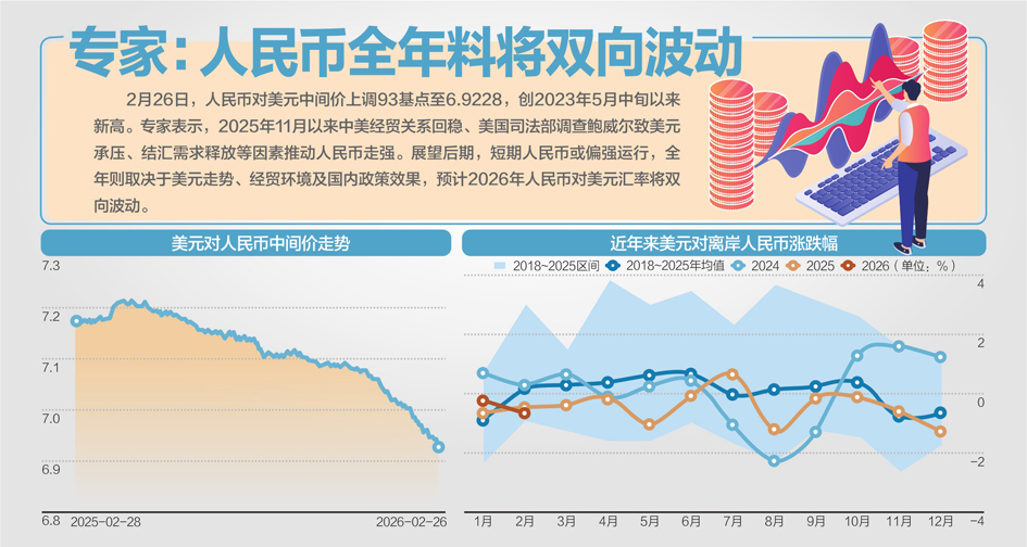 自2025年4月上旬以來,在岸人民幣對美元在波動中整體持續(xù)升值,至2025年底升破7.0關口,并于2026年春節(jié)前升破6.9。2月26日,在岸人民幣對美元盤中報6.8370,已升破6.85。