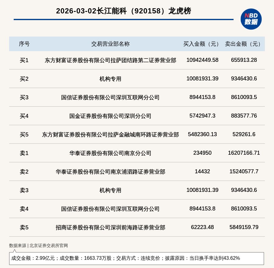 每經(jīng)訊,2026年3月2日,北交所上市公司長江能科(920158,收盤價:18.3元)登上龍虎榜,交易方式是連續(xù)競價,披露原因是當(dāng)日換手率達到43.62%,成交數(shù)量1663.73萬股,成交金額2.99億元。買一席位為東方財富證券股份有限公司拉薩團結(jié)路第二證券營業(yè)部,買入1094.24萬元;賣一席位為華泰證券股份有限公司南京分公司,賣出1620.72萬元。