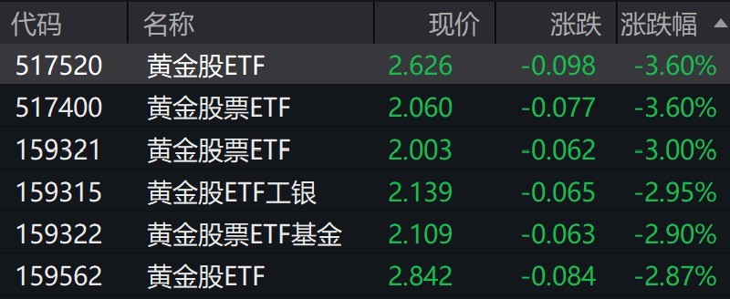 受盤面影響,黃金股相關(guān)ETF跌約3%。