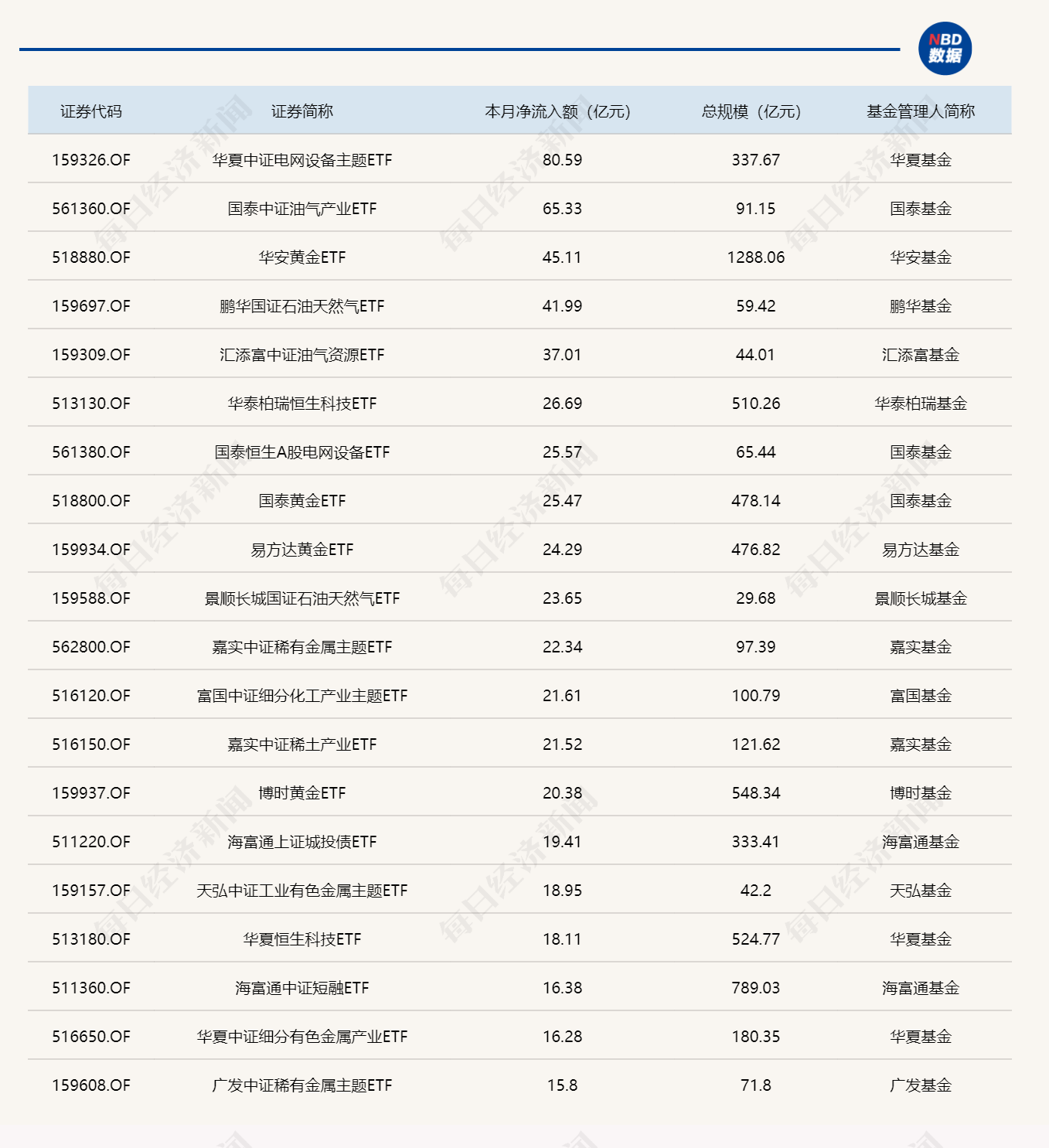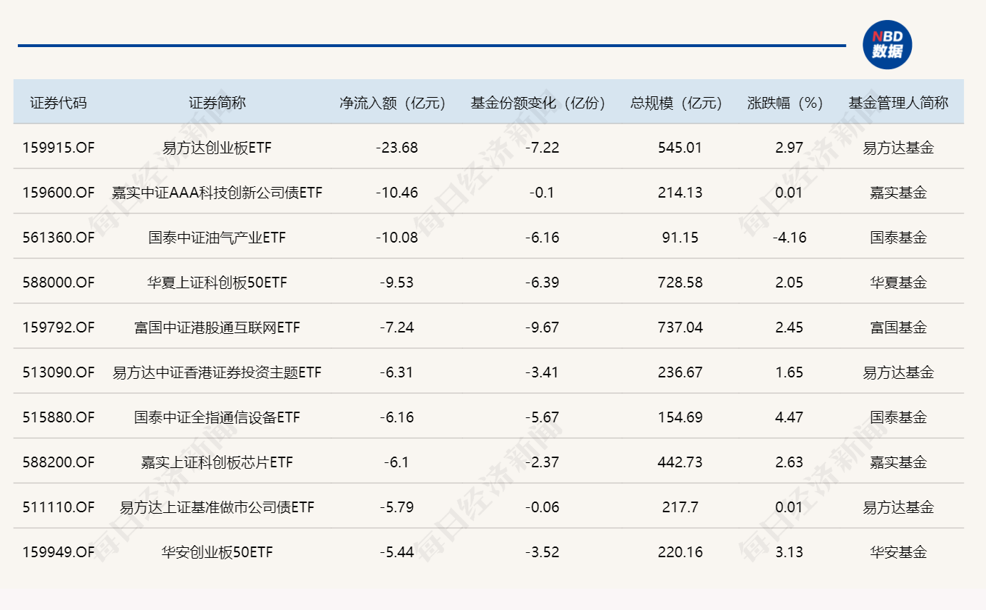 與此同時,易方達創(chuàng)業(yè)板ETF基金份額減少7.22億份,凈流出額23.68億元;嘉實中證AAA科技創(chuàng)新公司債ETF基金份額減少0.10億份,凈流出額10.46億元;國泰中證油氣產業(yè)ETF基金份額減少6.16億份,凈流出額10.08億元。