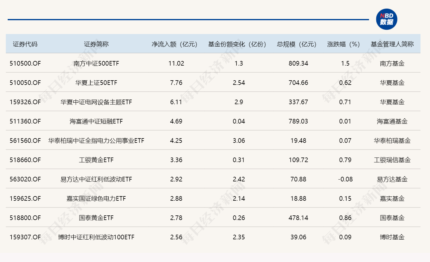 Wind數據顯示,在3月10日的非貨幣ETF市場中,南方中證500ETF基金份額增加1.30億份,凈流入額11.02億元;華夏上證50ETF基金份額增加2.54億份,凈流入額7.76億元;華夏中證電網設備主題ETF基金份額增加2.90億份,凈流入額6.11億元。