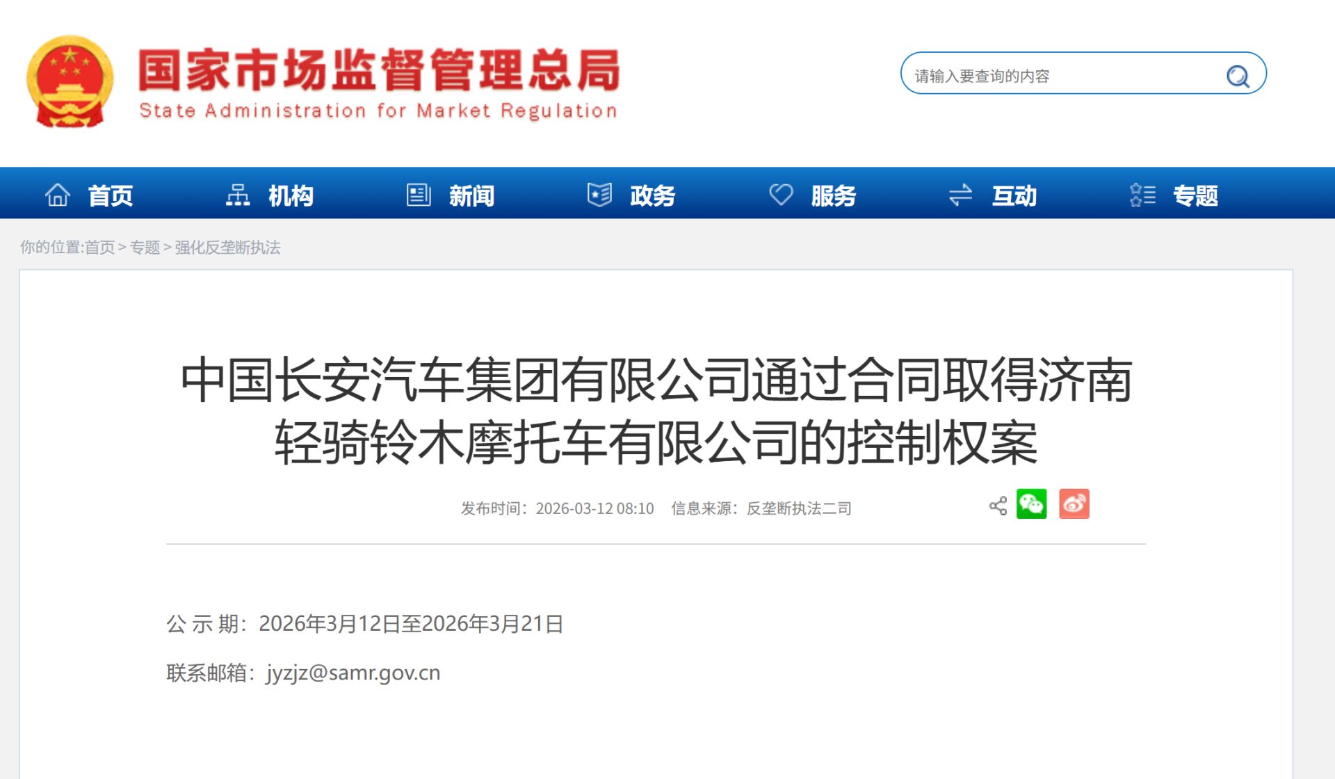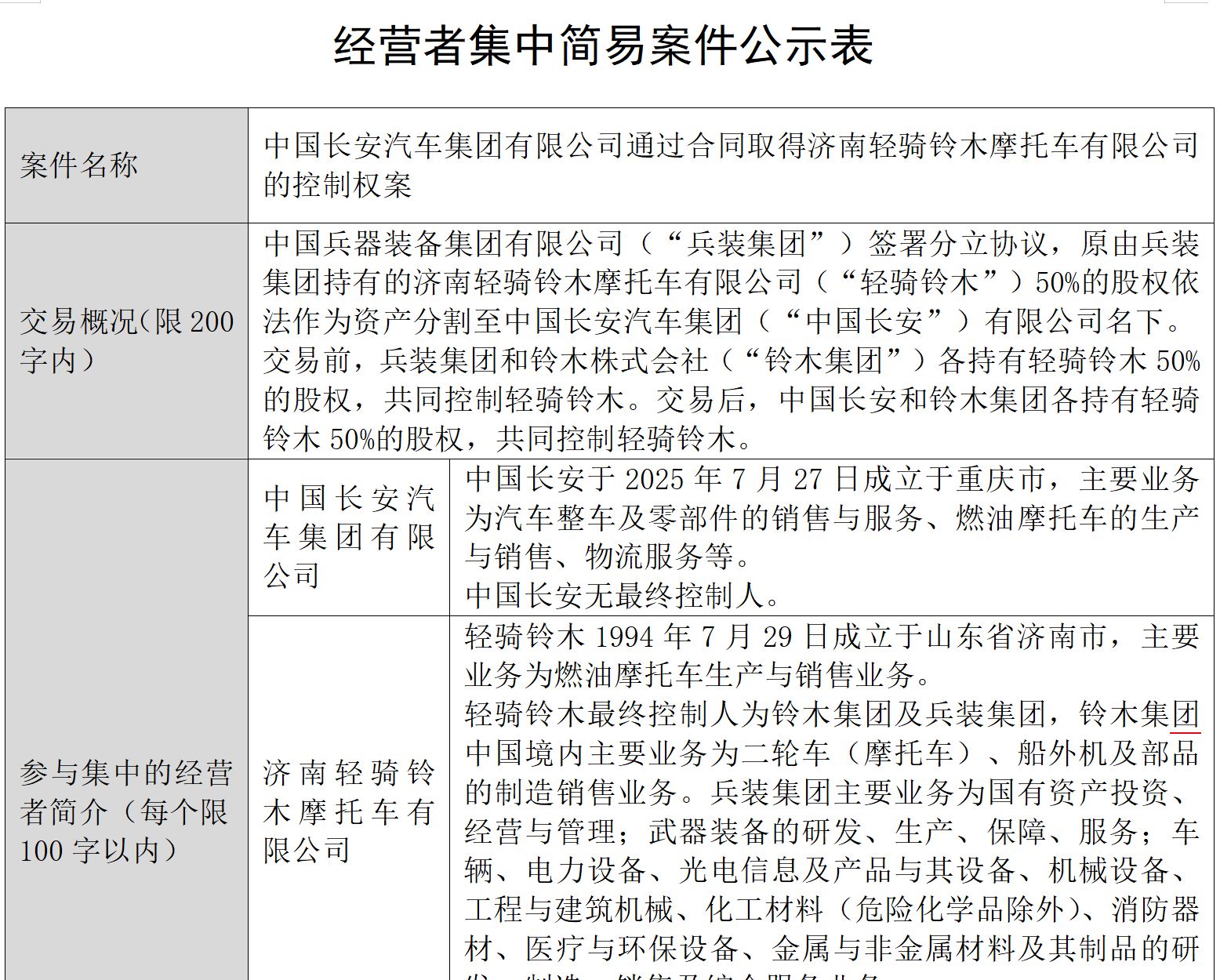 日前,《每日經(jīng)濟(jì)新聞》記者從國家市場監(jiān)督管理總局官網(wǎng)獲悉,反壟斷執(zhí)法二司已正式對“中國長安汽車集團(tuán)有限公司通過合同取得濟(jì)南輕騎鈴木摩托車有限公司的控制權(quán)案”進(jìn)行為期10天的公示。