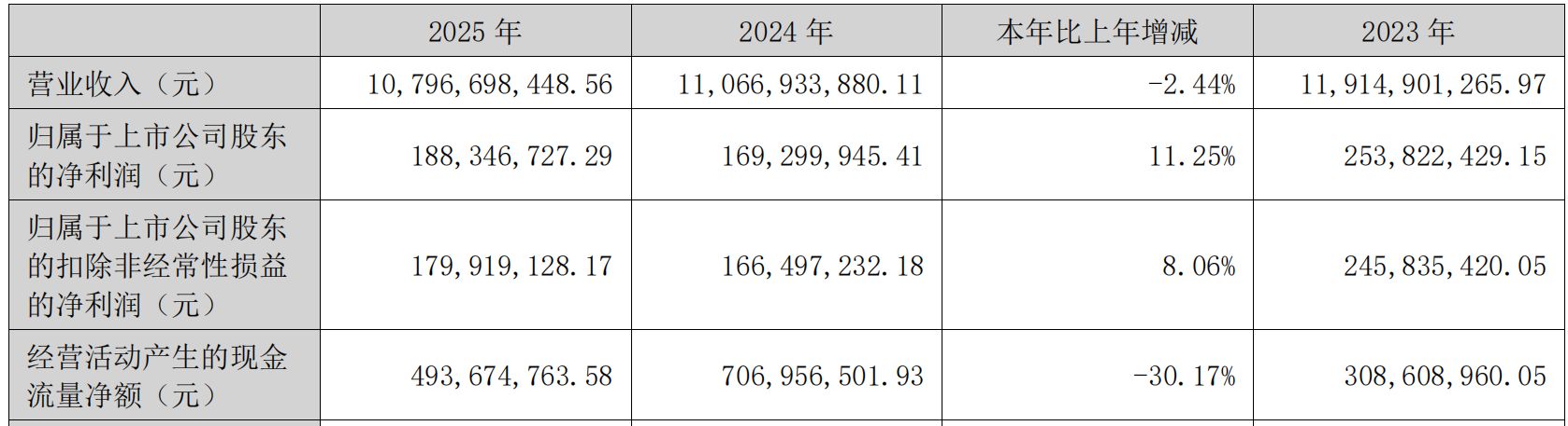 4月17日晚間,眾業(yè)達披露2025年年度報告,公司全年實現(xiàn)營業(yè)收入約107.97億元,同比下降2.44%;歸母凈利潤約1.88億元,同比增長11.25%。